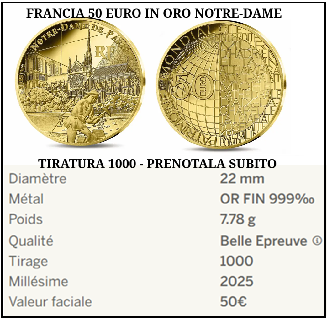 FRANCIA 50 EURO 2025 IN ORO CATTEDRALE NOTRE DAME DE PARIS – UNESCO