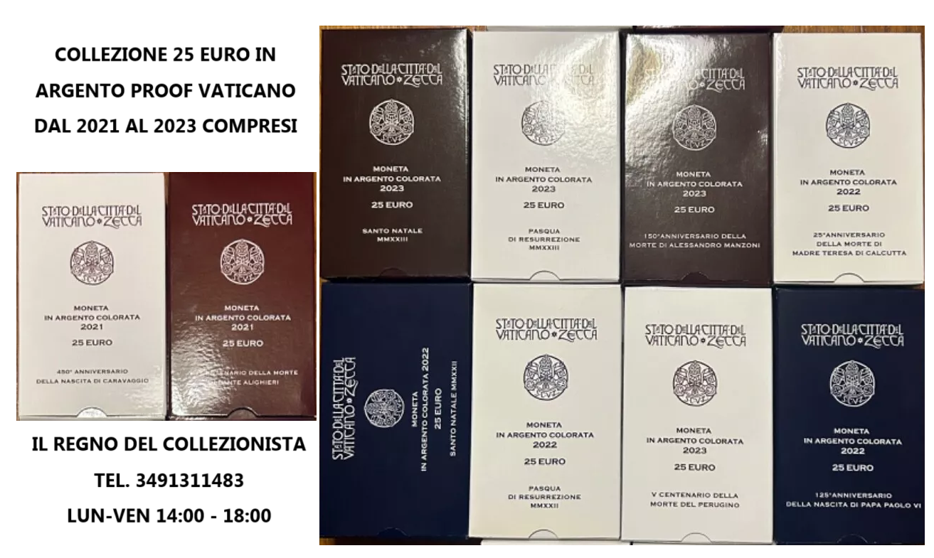 VATICANO COLLEZIONE DI MONETE DA 25 EURO IN ARGENTO PROOF COLORATE DAL 2021 AL 2023 COMPRESO